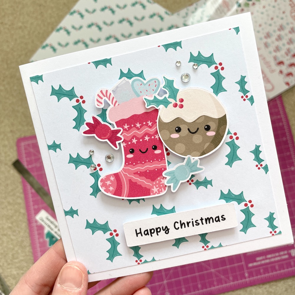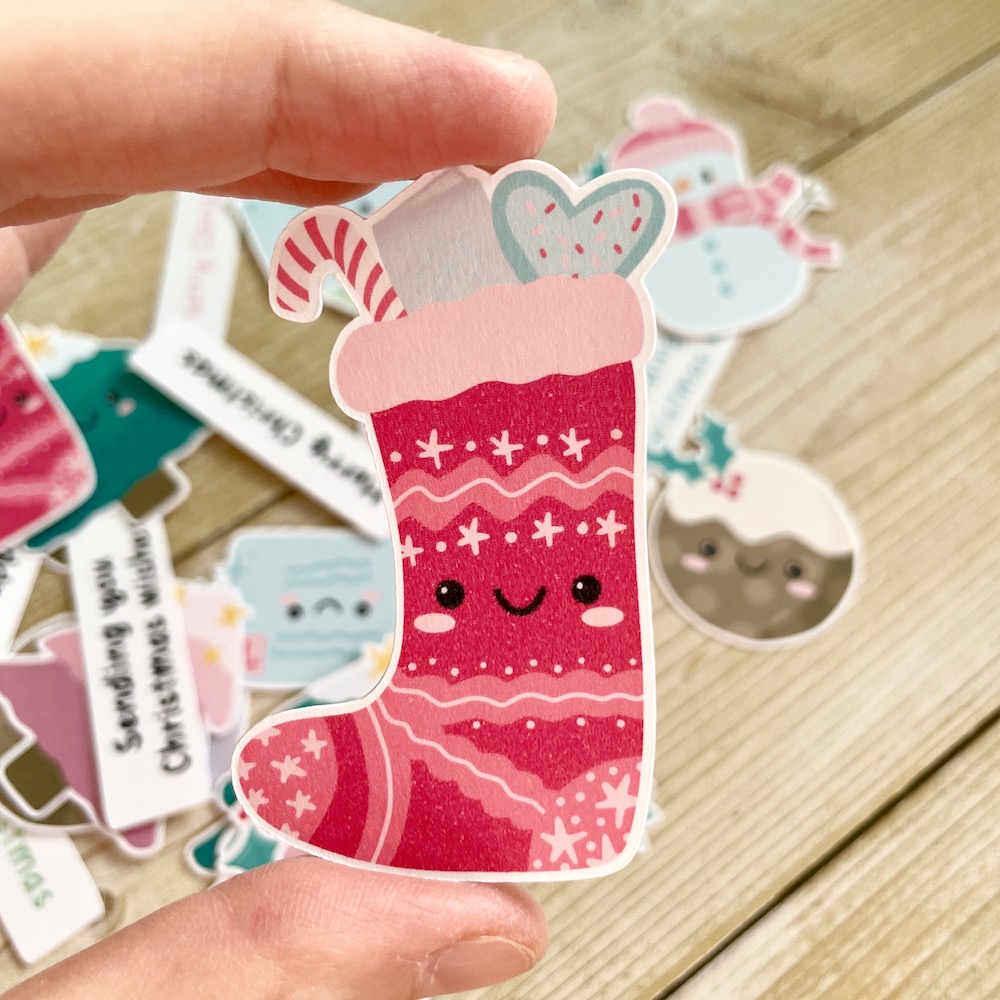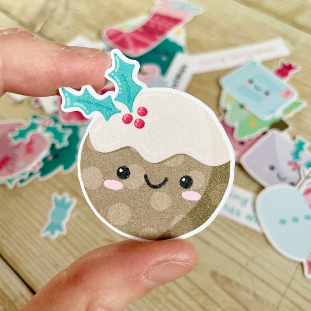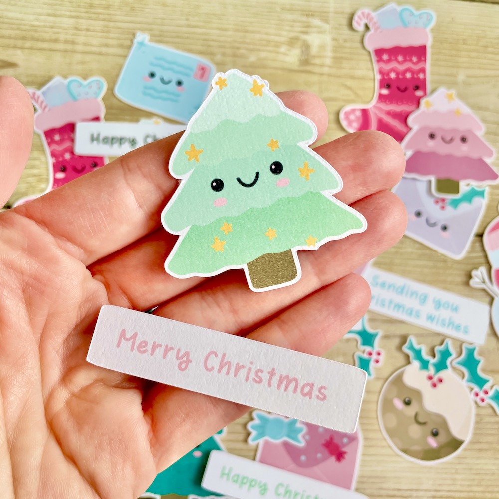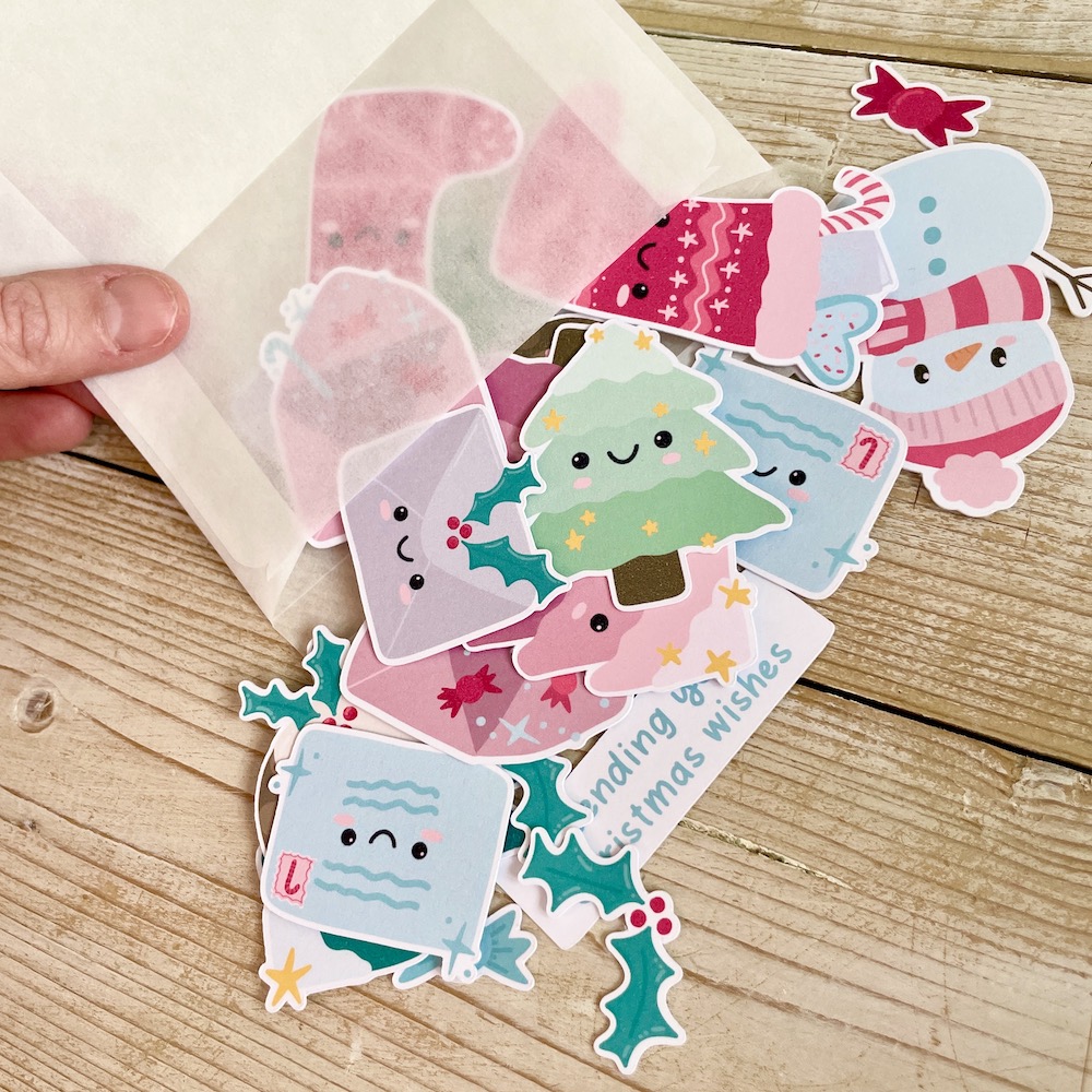 Cute Christmas Ephemera – adorable festive card making and scrapbooking toppers featuring Christmas trees, stockings, puddings, snowmen, happy mail envelopes, sentiments and more, all packaged in a lovely eco-friendly glassine bag. Designed, illustrated and made in the UK by StickerKitten.