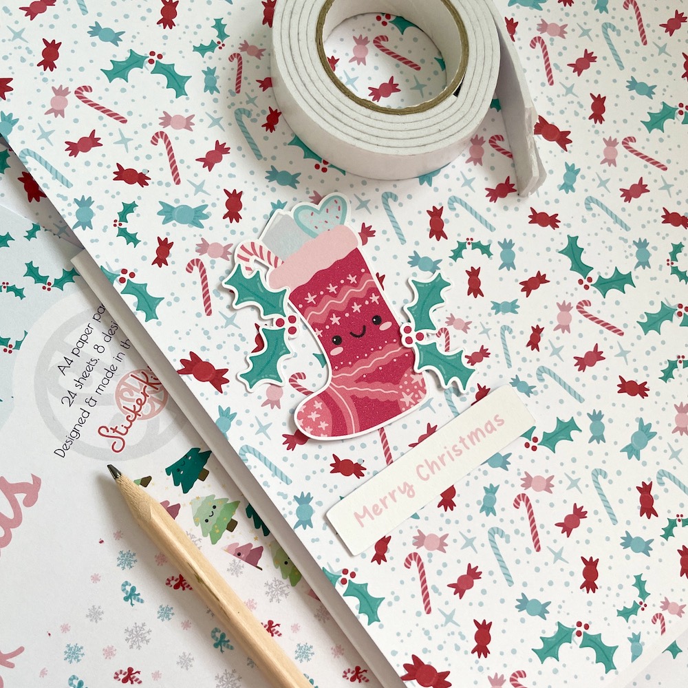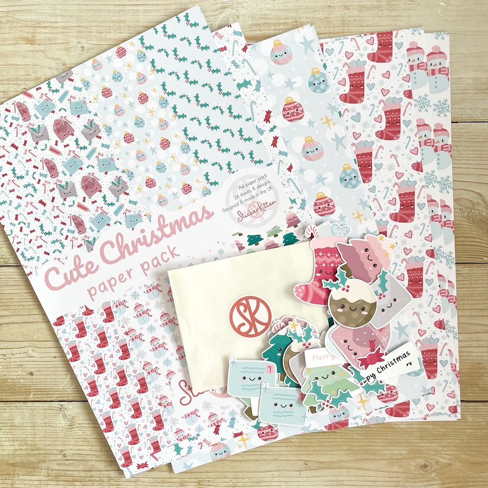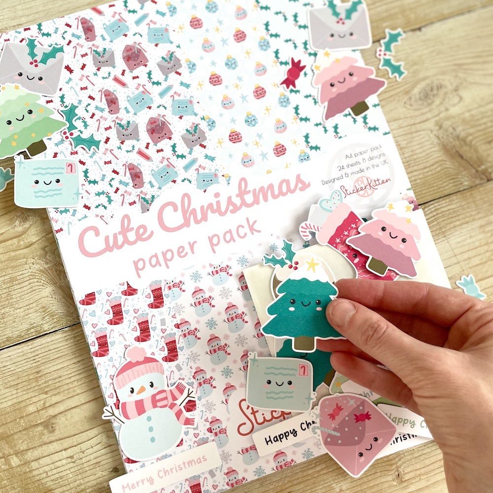 Our Cute Christmas A4 paper pack includes three sheets each of 8 adorable designs including Christmas stockings, snowmen, candy canes, Christmas trees, holly, baubles, envelopes and sweets. These patterned Christmas papers are perfect for cardmaking, scrapbooking, journalling and other papercraft projects. Designed, illustrated and made in the UK by StickerKitten, printed on FSC-certified paper and packaged in a compostable cello bag made of PLA (cornstarch-based eco plastic).